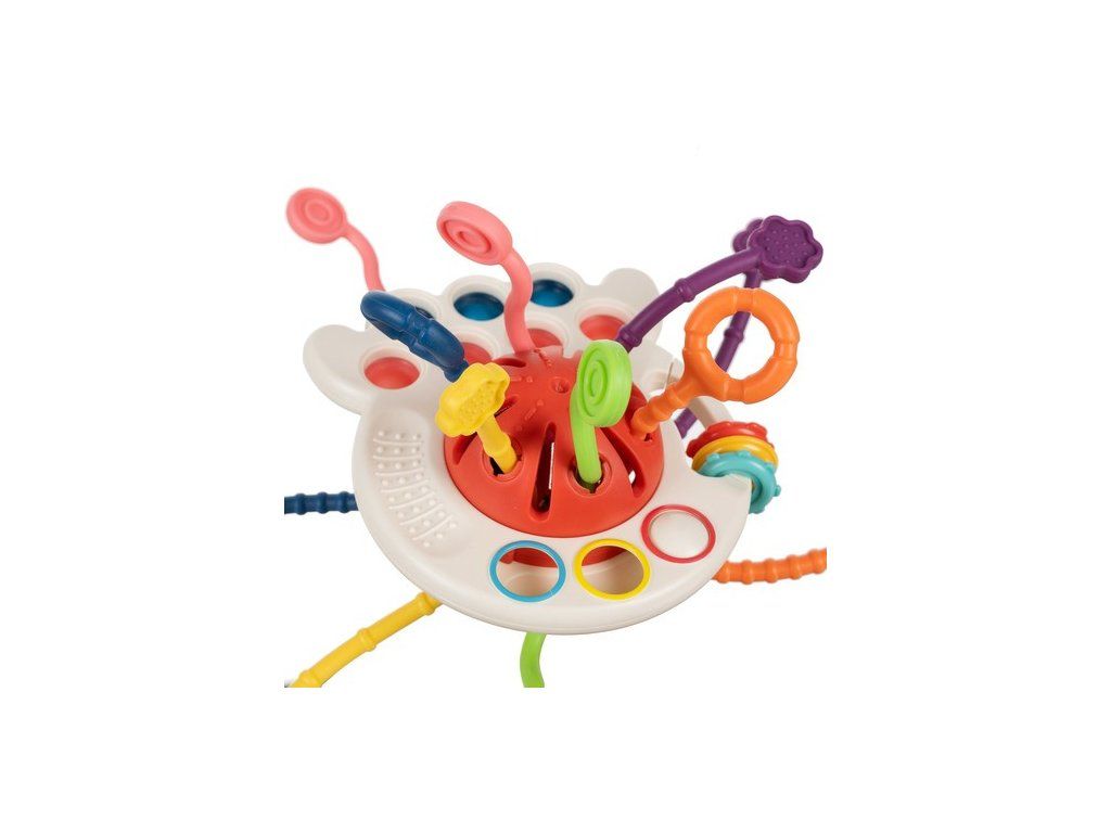 - 6v1 - kousátko je vybaveno šesti texturovanými strunami, které vydávají zvuky různé zvuky a vibrace jak je protahujete otvory. Struny mají různé konce, což pomáhá při nácviku úchopu a rozvoji jemné motoriky. Kousátko má měkké, kulaté knoflíky smyslové ve dvou řadách, které lze odsunout na druhou stranu. Tato funkce rozvíjí manuální dovednosti a koordinaci ruka-oko. Tři plastové kroužky s různými texturami poskytnout dítěti další hmatové podněty, které stimulují jeho hmat. Teether má povrch s výraznou kuličkovou texturou , která navíc stimuluje hmat dítěte.